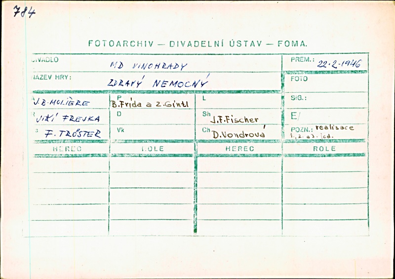 Argan:Vladimír Řepa; Belina:Libuše Freslová; Angelika:Marie Rosůlková; Louison:Dana Medřická; Berald:Gustav Hilmar; Kleant:Zdeněk Hodr; Pan Diaforus:Josef Vošalík; Tomáš Diaforus:Jaroslav Seník; Pan Purgon:Vladimír Šmeral; Pan Fleurant:Richard Záhorský; Pan Bonnefoi:Karel Jelínek; Toinetta:Jiřina Štěpničková; Toinetta:Jaroslava Adamová; Polichinelle:Josef Bělský; Flora:Zdeňka Kožíková; Italská zpěvačka:Jiřina Švorcová (j.h.); Lékaři a strážníci::Karel Jelínek; Richard Záhorský; Josef Šmíd; Jan Fišer; Skupina vlašských komediantů,:; lékaři, lékárníci a strážníci.: