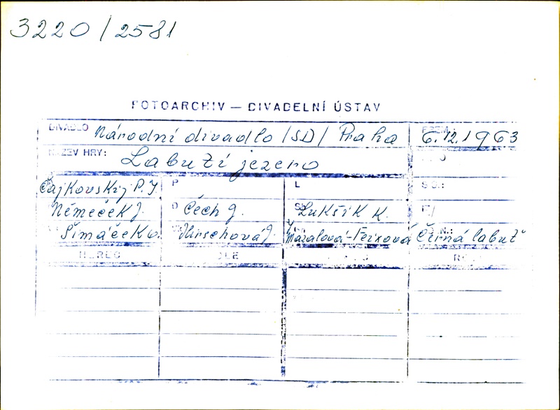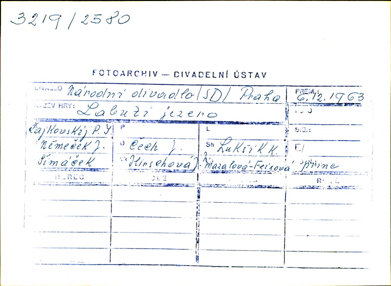 Odetta:Olga Skálová (alternation); Marta Drottnerová (alternation); Princ:Jaromír Petřík (alternation); Bohumil Reisner (alternation); Odillie:Jarmila Manšingrová (alternation); Olga Skálová (alternation); Marta Drottnerová (alternation); Kouzelník Rudovous:Vlastimil Jílek (alternation); Otto Šanda (alternation); Pavel Ždichynec (alternation); Vladařka:Marie Kácová (alternation); Rimma Charvátová (alternation); Šašek:Zdeněk Doležal (alternation); Jaroslav Čejka (alternation); Ivan Bužga (alternation); Ceremoniář:Evžen Souček (alternation); Bohumil Klika (alternation); Oldřich Stodola (alternation); Oldřich Král (alternation); Tomáš Němeček (alternation)