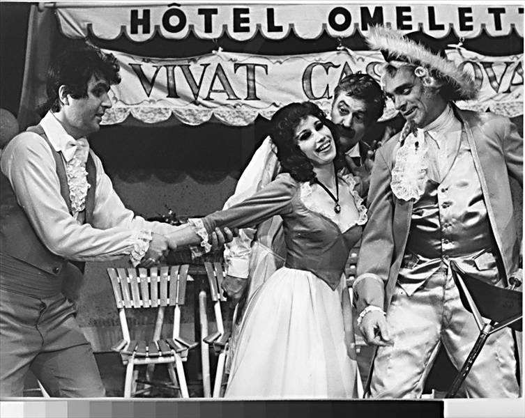 Casanova:Antonín Julínek (alternation); František Zacharník (alternation); Denisa:Libuše Bartošková (alternation); Eva Veškrnová (alternation); Passarelli:Milan Pokorný (alternation); Miroslav Výlet (alternation); Doktor:Jiří Brož (alternation); Jiří Horký (alternation); Omeletto:Jiří Jurka (alternation); Arnošt Škoda (alternation); Carmela:Libuše Bartošková (alternation); Eva Veškrnová (alternation); Starosta:Ladislav Jurečka; Alfredo:Jiří Brabec (alternation); Radomír Linhart (alternation); Farář:Ivo Heger; Piola:Pavel Třetina; Mantovani:Ondřej Šeda (alternation); Rosselini:Pavel Pavlík; Orsi:Ota Filip; Veronika:Adéla Polášková; Magdalena:Olga Bílková; Asunta:Vladimíra Turečková; Angela:Marie Kobylinská; Rosina:Hana Sisrová; Sophia:Aranka Hrdličková; Gilda:Hana Králová; Filomena:Edita Rosprimová; Kostelník:Petr Šiška; Kostelníkův bratr:Josef Dvořák