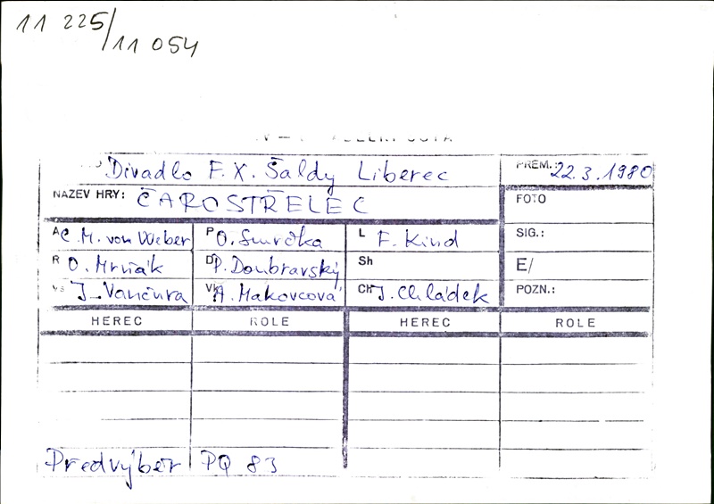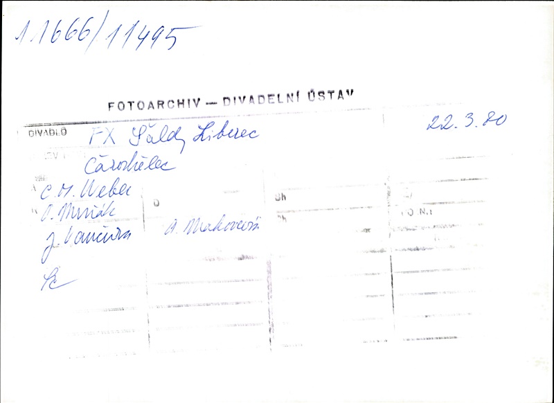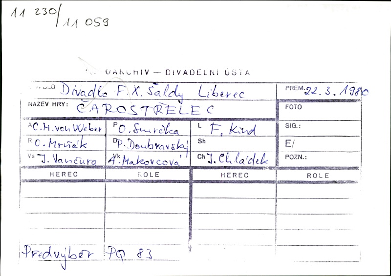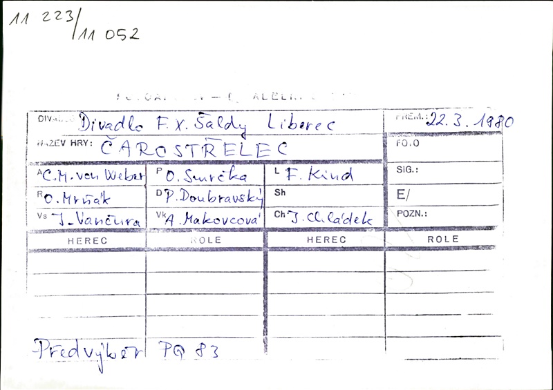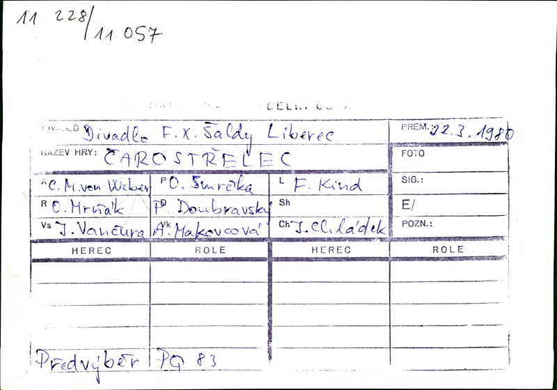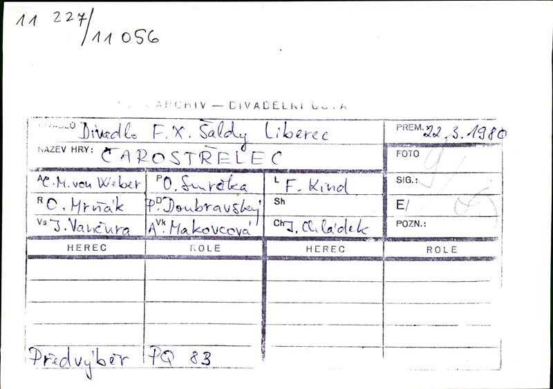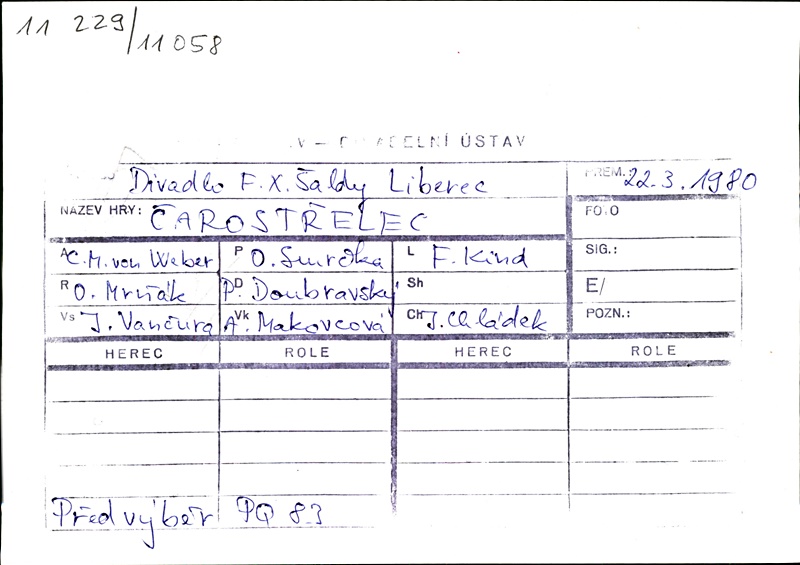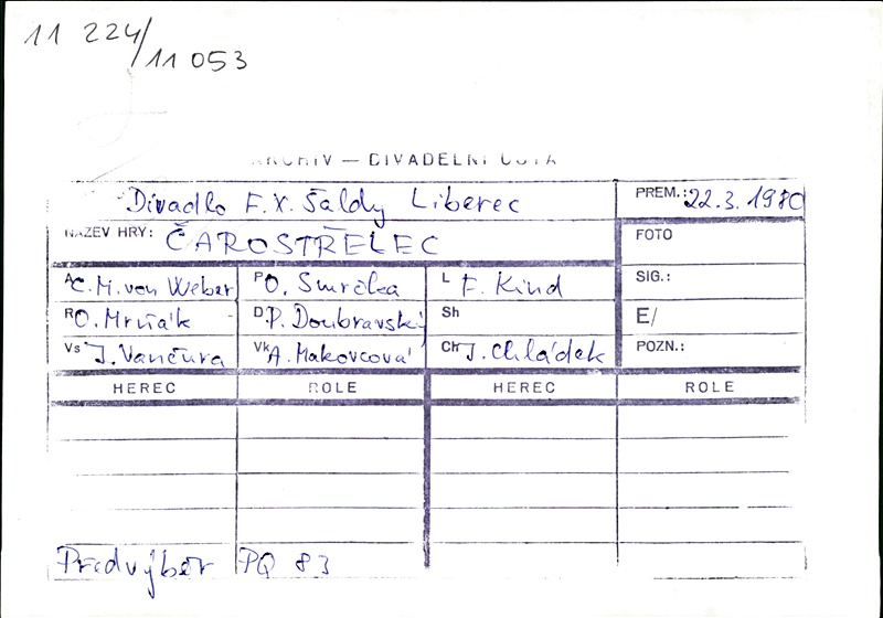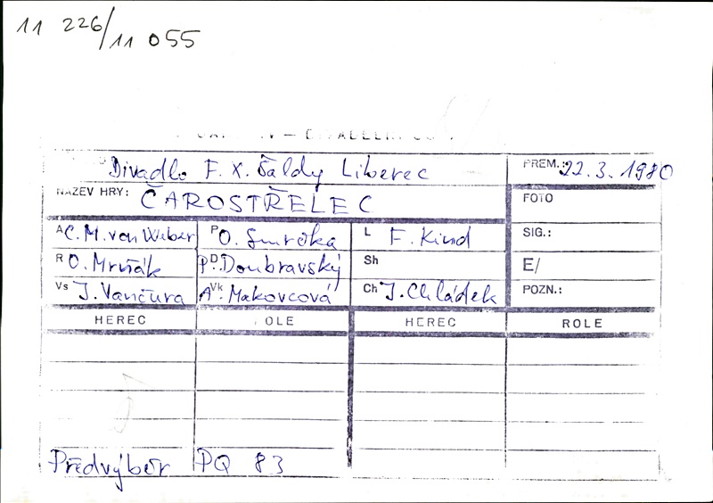 Kníže Otokar:Pavel Červinka (alternation); František Dáňa (alternation); Kuno, dědičný polesný:Rafael Kubita (alternation); Vladimír Šorsák (alternation); Agáta, jeho dcera:Marie Kremerová (alternation); Alena Žaloudková (alternation); Anička, její příbuzná:Oldřiška Procházková (alternation); Svatava Slavíčková (alternation); Kašpar, myslivecký mládenec:Arnošt Klíma (alternation); Luděk Vele (alternation); Max, myslivecký mládenec:Stanislav Dašek (alternation); Jan Malík (alternation); Samiel, černý myslivec:Oldřich Mrňák (alternation); Jan Žižka (alternation); Eremita:Arnošt Klíma (alternation); Rafael Kubita (alternation); Kilián, bohatý sedlák:Jan Bajer (alternation); Jan Panenka (alternation); Družičky:Irena Daníčková; Daniela Krejčíková; Helena Malíková