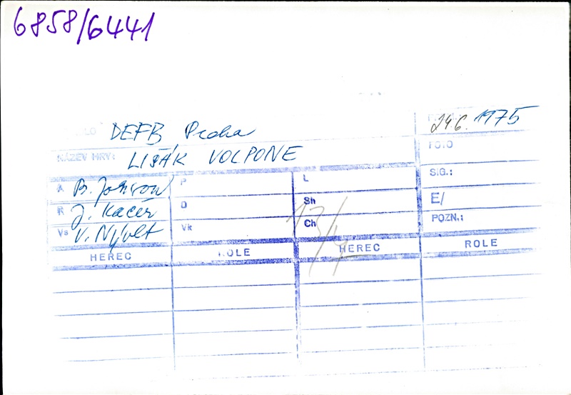 Volpone (Lišák):Ferdinand Krůta; Mosca (Moucha):Jiří Ornest; Nano, trpaslík:František Svačina (j.h.); Carbaccio (Krkavec):Jiří Němeček; Voltore (Sup):Josef Langmiler; Carvino (Vrána):Václav Bouška; Corbacciův syn:Michal Pavlata; 1. soudce:Radúz Chmelík; 2. soudce:Vladimír Huber; 3. soudce:Jan Bartoš; Soudní písař:Karel Parez (j.h.); Celie, Corvinova žena:Milena Dvorská; Lady La Gazza:Viola Zinková; Benátští muži:Michal Nesvadba (studující); Martin Učík (studující); Benátské ženy:Dana Bartůňková (studující); Gabriela Rittichová (studující); Jana Staňková (studující)