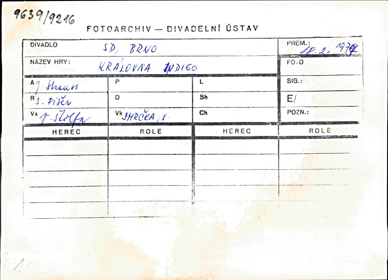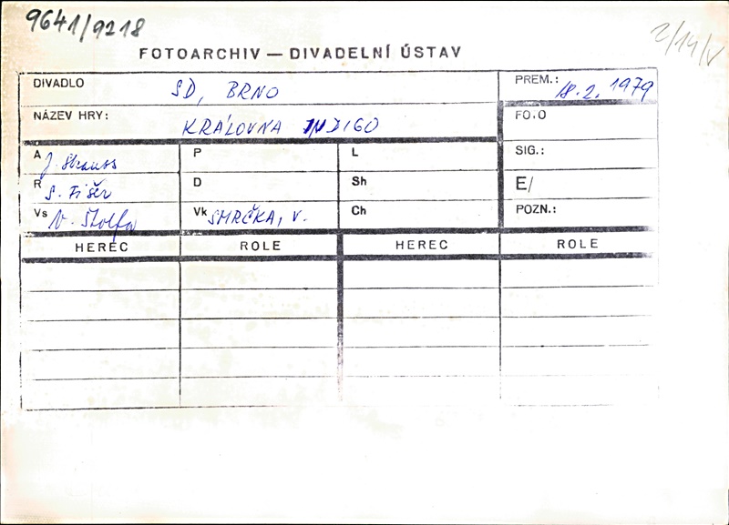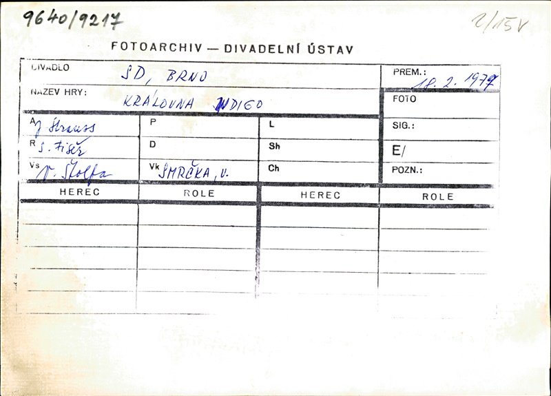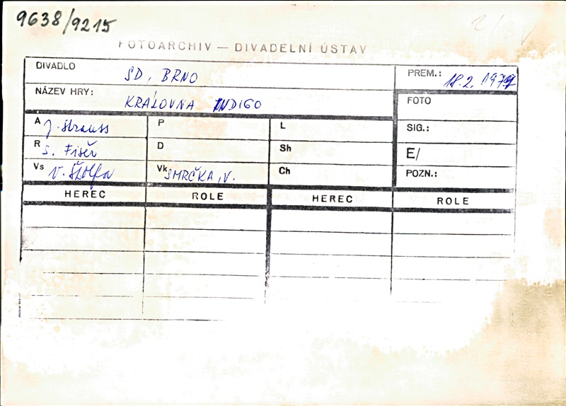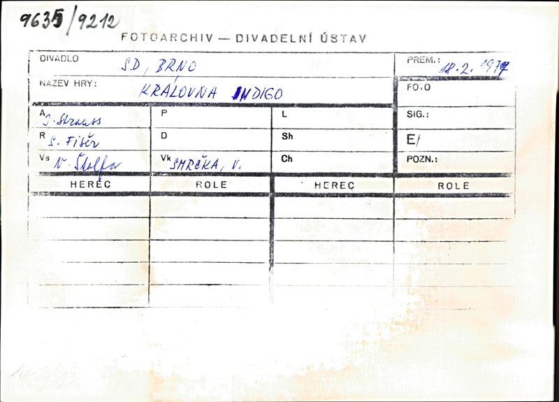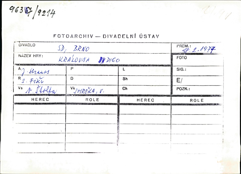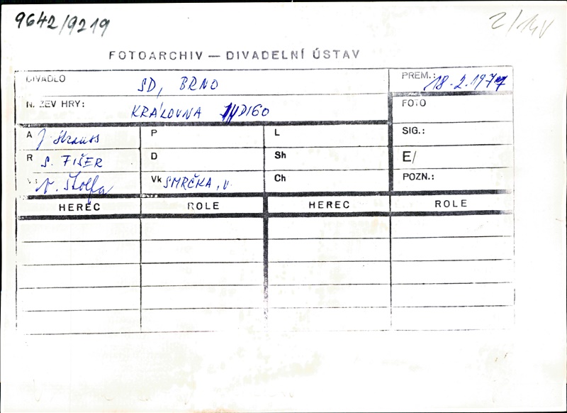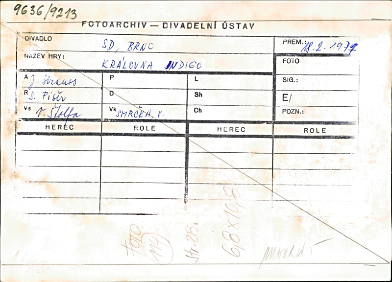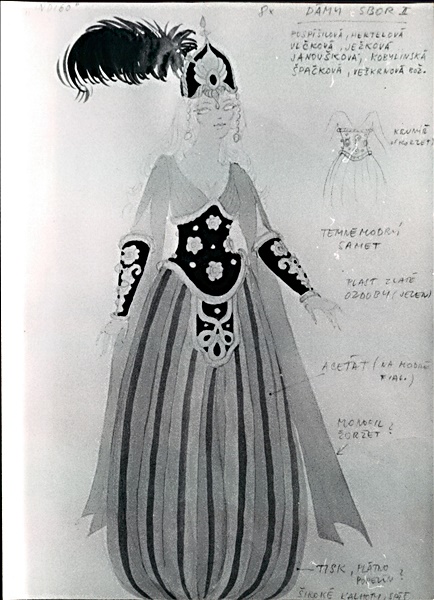 Translation:Vladimír Fux; Stage Director:Stanislav Fišer; Conductor:Arnošt Moulík; Chorus Master:Dagmar Komárková; Choregrapher:Luboš Ogoun; Set Designer:Vojtěch Štolfa; Costume Designer:Vladimír Smrčka (j. h.); Choreography Cooperation:Dana Vejchodová