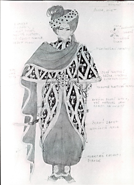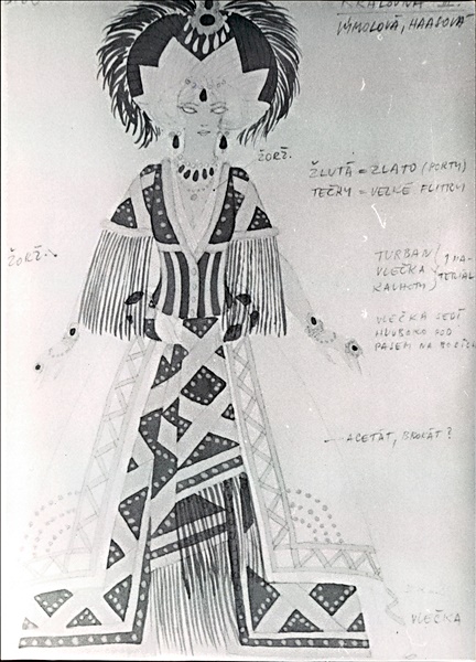 Tramtarára:Eva Výmolová (alternation); Olga Haasová (alternation); Fantasca:Jana Bézová (alternation); Věra Pochylá (alternation); Janio:Jiří Holešovský (alternation); Ján Konstanty (alternation); Romadour:Arnošt Škoda (alternation); Miroslav Výlet (alternation); Babazuk:Milan Horský (alternation); František Zacharník (alternation); Myzuf:Jiří Jurka (alternation); Milan Pokorný (alternation); Otrokář:Otakar Staněk; Eunuch:Alois Kocman (alternation); Ladislav Jurečka (alternation); Banana:Něva Megová; Zubeida:Jana Mrázová; Farniente:Milena Herzová; Venusie:Eva Čudanová; Boubellina:Karla Halíková; Tulipa:Jarmila Karvašová; Chrysis:Hana Sísrová; 1. obchodnice:Alena Pospíšilová; 2. obchodnice:Marie Kobylinská; 3. obchodnice:Věra Janoušková