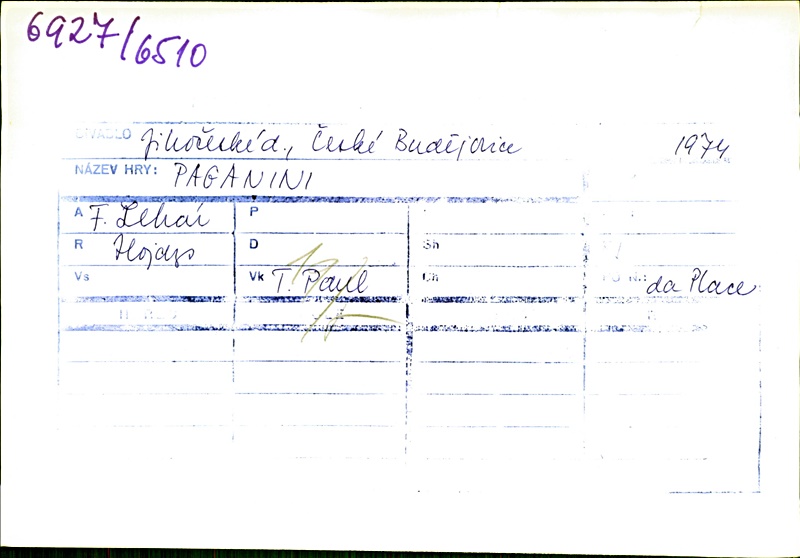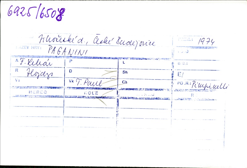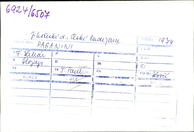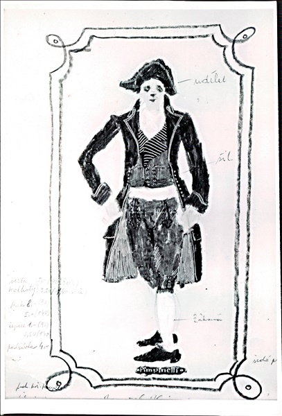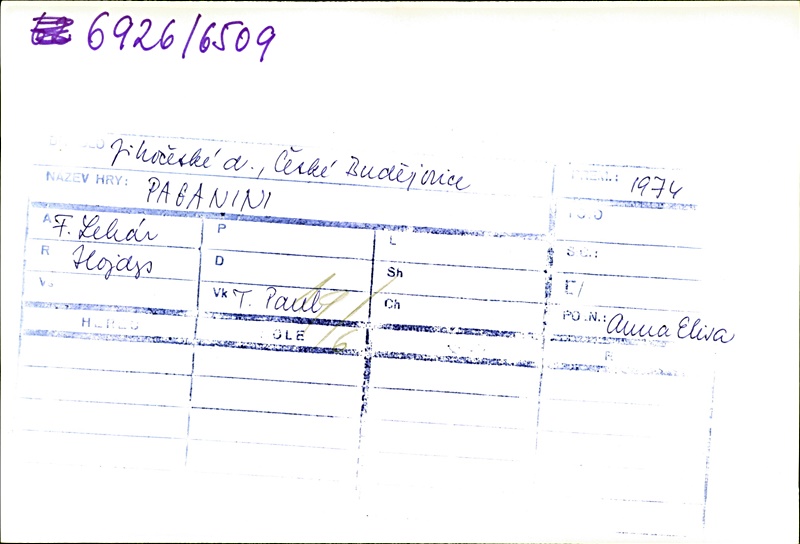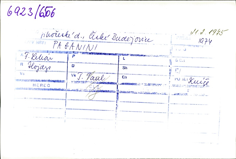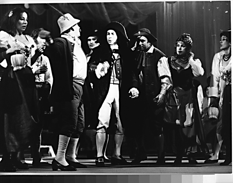Maria Anna Elisa:Naděžda Honzíková (alternation); Eva Valentová (alternation); Kníže Felice Baccicechi:Otakar Dubský (alternation); Karel Fuk (alternation); Nicolo Paganini:Vladimír Voborník; Bartucci:Josef Průdek (alternation); Josef Hajna (alternation); Giacomo Pimpinelli:Vladimír Janoušek; Bella Giretti:Helena Hlaváčová (alternation); Štěpánka Hraničková (alternation); Hraběnka La Place:Jiřina Pourová; Hrabě Hedouville:Stanislav Stolbenko; Marco:René Pour; Philippo:Václav Záveský; Emanuele:Vít Frejvald; Hostinský Antonio:Miroslav Burda; Knížecí lovčí a ceremoniář:Jan Böhm; Julia:Marie Říhová; Komorná:Věra Zabilková; Corallina:Věra Kosinová; Anitta:Jiřina Bastlová; Tofolo:René Pour; Foletto:Václav Záveský; Beppo:Miroslav Burda; Sólo ve 2.dějství tančí:Radmila Hájková; Jiří Hájek; Tarantellu ve 3.dějství tančí:Oldřich Rymeš; Ludmila Podzimková