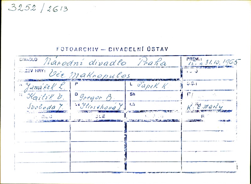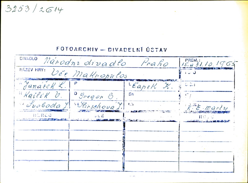 Emilia Marty:Alena Míková; Jaroslav Prus:Zdeněk Otava; Janek:Zdeněk Švehla; Albert Gregor:Ivo Žídek; Hauk-Šendorf:Antonín Votava; JUDr. Kolenatý:Karel Berman; Vítek:Rudolf Vonásek; Kristina:Helena Tattermuschová; Komorná Martyové:Milada Musilová; Strojník na jevišti:Jiří Joran; Uklízečka na jevišti:Jaroslava Dobrá