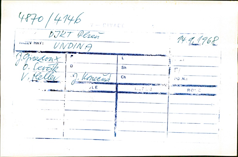 August:Jiří Kostka; Evženie:Inez Hofbauerová; Wittenstein:Viktor Vrabec; Undina:Svatava Šanovcová; Král vodníků:Miloslav Včala; Dvorní maršálek:Jaroslav Choc; Generální intendant:František Baťka; Bertha:Věra Vlčková; Bertram:Milan Vlachovský; Violanta:Marta Světlíková; Angelika:Cvetana Igová; Král:Jaroslav Kníže; Isolda:Jarmila Balašová; Sluha:Miroslav Popek; Rybář:Pavel Pípal; 1. soudce:Jiří Samek; 2. soudce:Jiří Chmelař; Služka:Eva Wimmerová