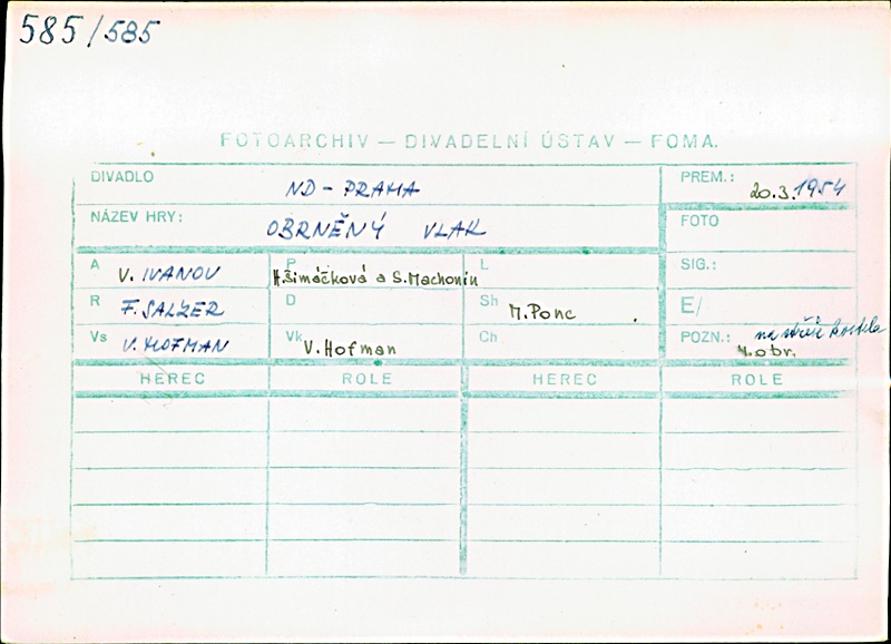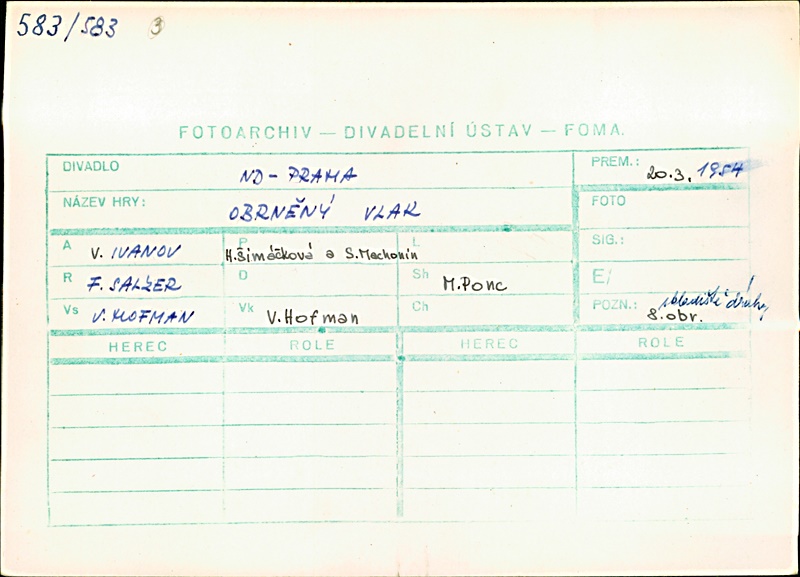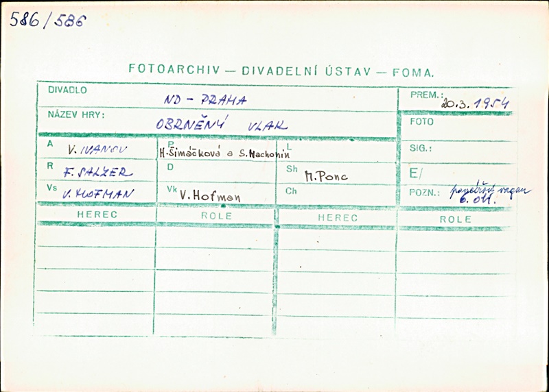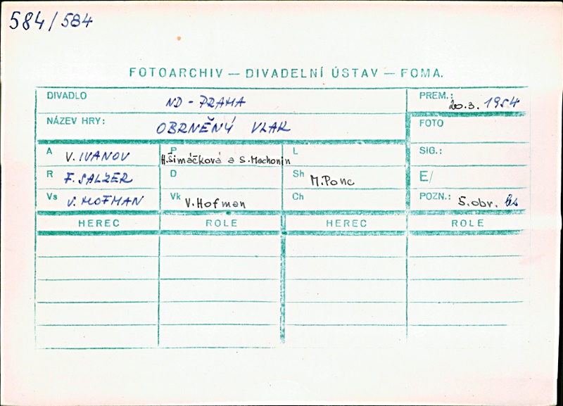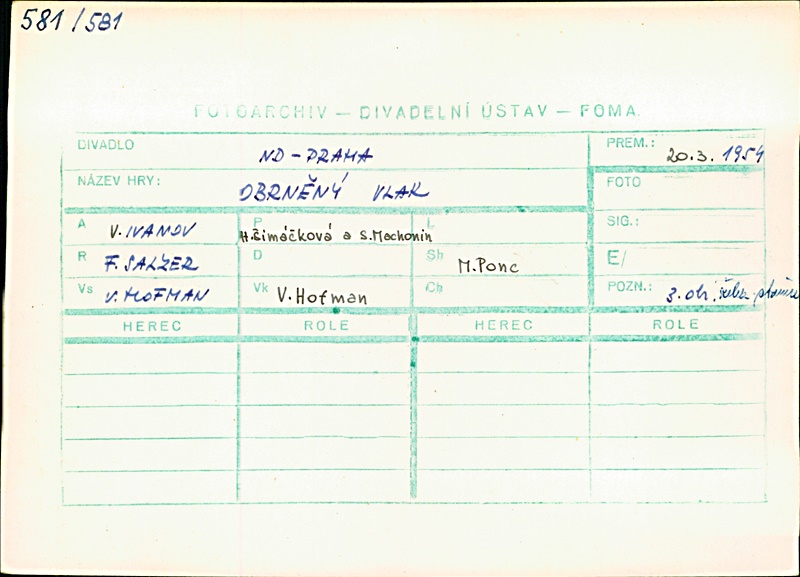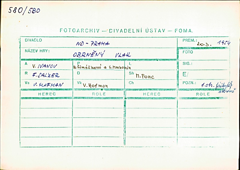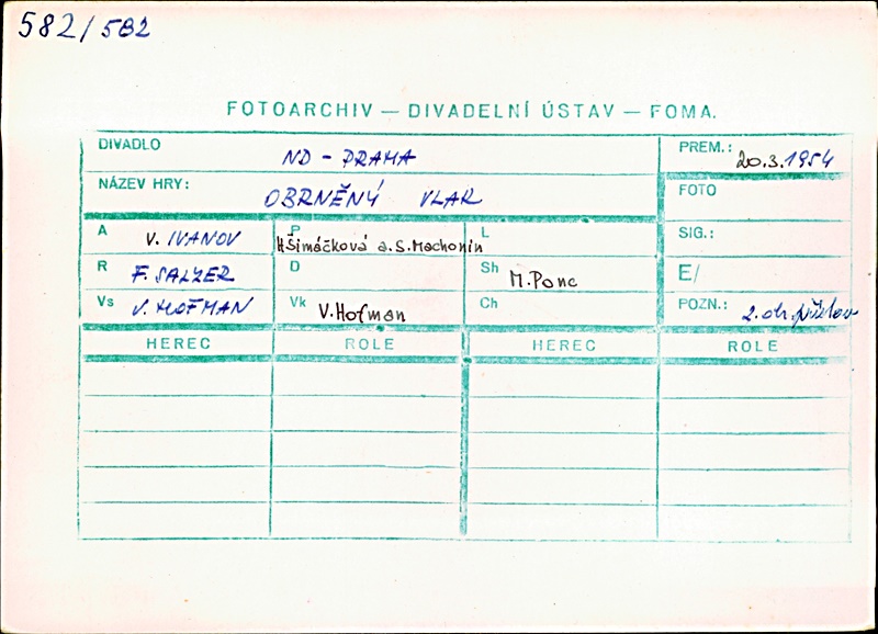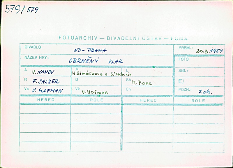 Stage Director:František Salzer; Assistant Director:Václav Švorc; Assistant Director:Eliška Poznerová; Set Design:Vlastislav Hofman; Music:Miroslav Ponc