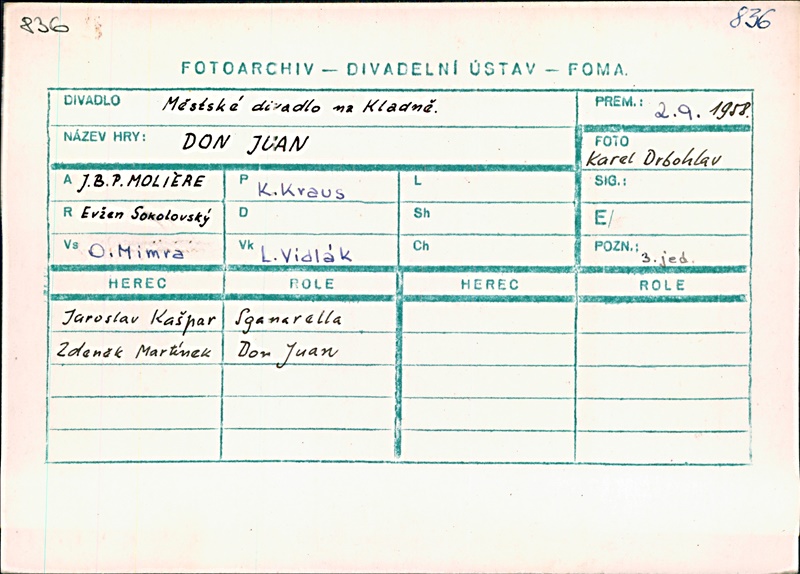 Don Juan:Zdeněk Martínek; Sganarelle:Jaroslav Kašpar; Elvíra:Jitka Součková; Gusman:Miroslav Samek; Don Carlos:Zdeněk Jarolímek; Don Alonso:Václav Stýblo; Don Luis:Kamil Blahovec; František:Václav Budínský; Dorotka:Jiřina Chlumská; Majdalena:Marie Beránková; Jiřík:Jaroslav Němeček; Fialka:Josef Pospíšil; Pořízek:Pavel Otto; Pan Nedělka:František Kropáček; Hlas komtura:Čestmír Válek