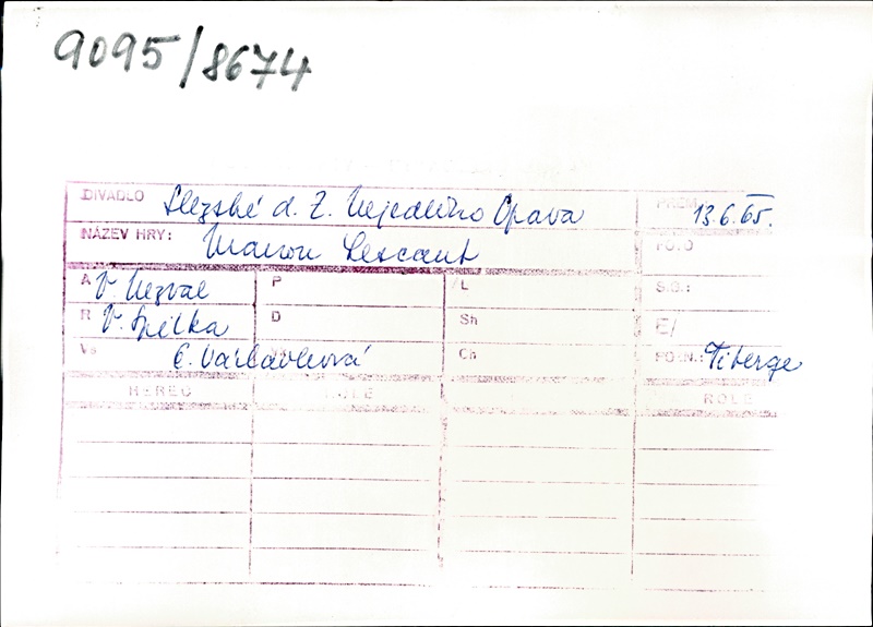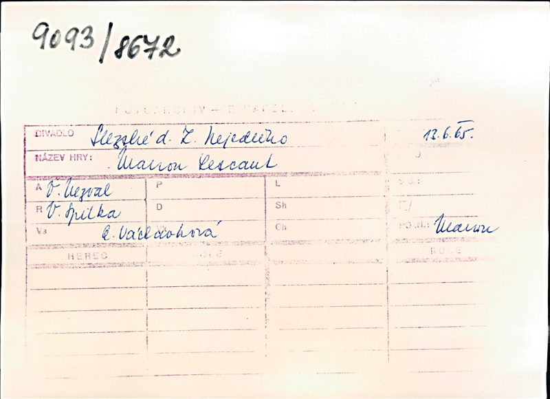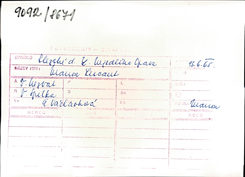 Manon Lescaut:Aranka Lapešová (alternation); Hana Franková (alternation); Pierre:Josef Navrátil; Marcela:Miluše Jánská; Rytíř des Grieux:Jaromír Polčík (alternation); Lubomír Vraspír (alternation); Tiberge:Antonín Beba; Duval:Antonín Tázlar ml.; Sluha:Vladimír Kořínek; Modesta:Edita Dindělová; Hostinský:Jaroslav Fert; Krčmářka:Eva Záběhlická; Velitel výpravy:Jaroslav Vopálka; Slepý žebrák:Patrik Horálek; Synelet:Jindřich Suchopár