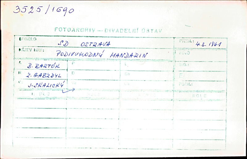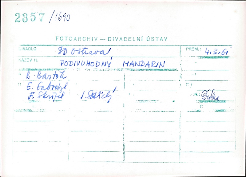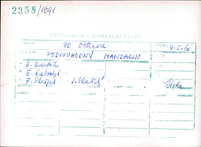 Choregrapher:Emerich Gabzdyl; Assistant Choroegrapher:Julie Jastřembská; Stage Director:Emerich Gabzdyl; Costume Designer:Jan Skalický (j.h.); Conductor:František Vajnar; Set Designer:Jan Obšil