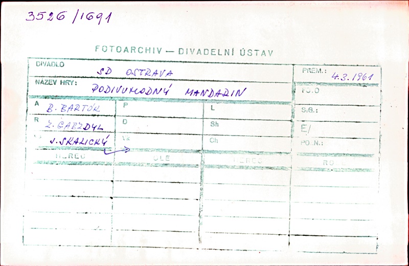 Dívka velkoměsta:Vlasta Pavelcová (alternation); Marcela Martiníková (alternation); Tři kumpáni:Rudolf Brom (alternation); Ivan Mičola (alternation); Jiří Duží (alternation); Karel Jurčík (alternation); Jan Dlask (alternation); Josef Radil (alternation); Záletník:Karel Jurčík (alternation); Albert Janíček (alternation); Ladislav Mašek (alternation); Mladík:Jiří Čejka (alternation); Jiří Duží (alternation); Lehké ženy:Alena Kadlecová; Lehké ženy:Ljuba Jansová; Lehké ženy:Karla Hrdinová; Lehké ženy:Elen Colombová; Mandarin:Albert Janíček (alternation); Bohuslav Pašek (alternation); Povaleči:Ladislav Mašek; Povaleči:Jan Dlask; Povaleči:Miloslav Nohel; Povaleči:Leo Krawiarz; Strážník:Jiří Hájek
