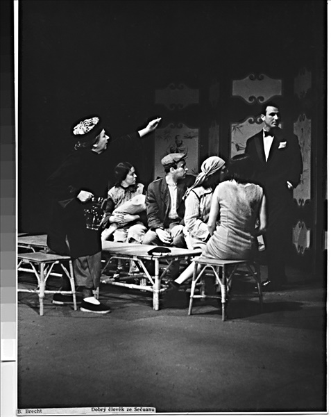 Wang:Bohdan Denk; První bůh:Leopold Franc; Druhý bůh:František Šec; Třetí bůh:František Brož; Šen-Te:Věra Bublíková; Jang Sun:Zdeněk Ornest (alternation); Ilja Racek (alternation); Paní Jangová:Arna Pekárková; Vdova Šinová:Marie Preislerová; Muž:Miroslav Horák; Žena:Libuše Matějová; Synovec:Václav Bicek (j.h.); Bratr:Zdeněk Ornest (alternation); Ilja Racek (alternation); Švagrová:Dagmar Buková (j.h.); Dědeček:Karel Kubes; Neteř:Olga Doležalová; Chlapec:Bohouš ml. Koukal; Truhlář Lin Tuo:Bohuslav Čáp; Majitelka domu Mic:Vlasta Kleinová; Strážník:František Řehák; Obchodník koberci:Bohumír Koukal; Jeho žena:Ludmila Dudešková (j.h.); Holič Šu Fu:Kamil Marek; Bonz:Jan Pecina (j.h.); Číšník:Eduard Pavlíček; Nezaměstnaný:Milan Vágner