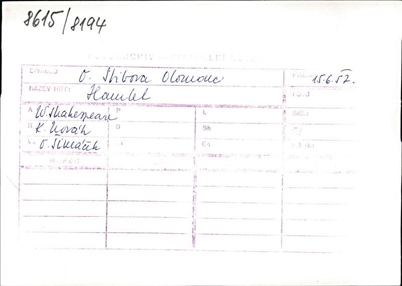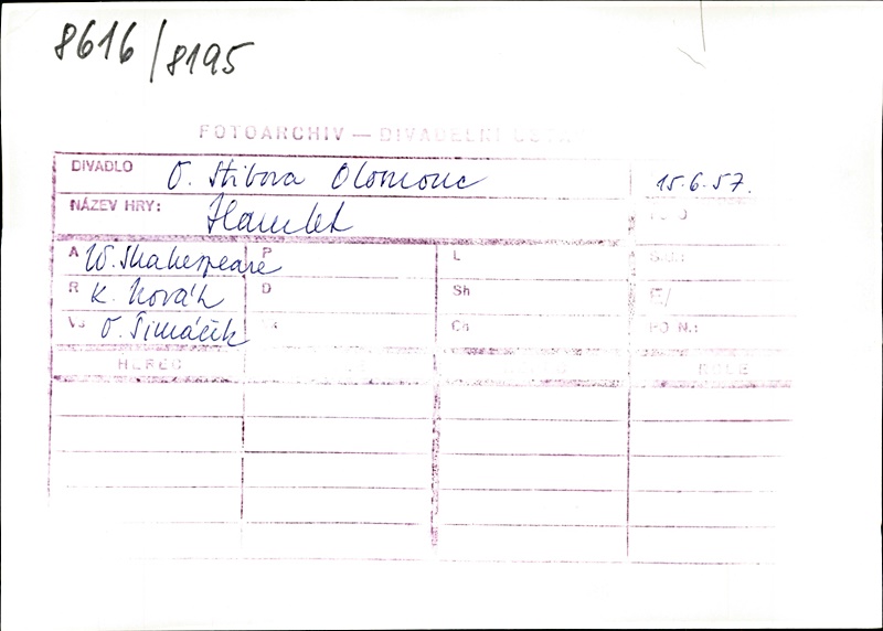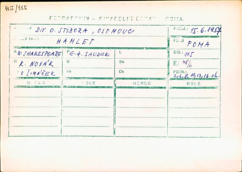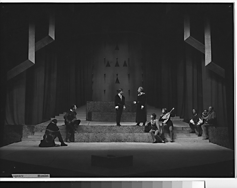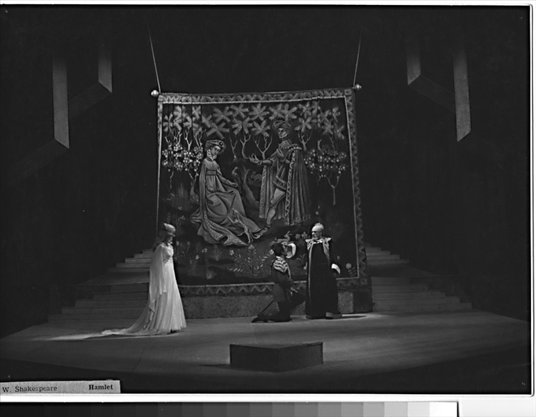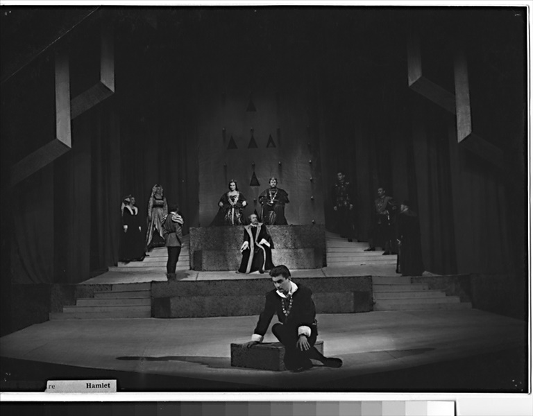 Klaudius:Kamil Marek; Hamlet:Radúz Chmelík (alternation); Ilja Racek (alternation); Fortinbras:Otakar Vážanský; Horacio:Miloslav Musil; Polonius:František Brož; Laertes:Alois Ostr; Voltimand:Karel Konečný; Kornelius:Věkoslav Krejzlík (j.h.); Šlechtic:Ivan Oslejšek; Setník:Josef Husník; Důstojník:Jan Pecina (j.h.); Rosencrantz:Bohdan Denk; Guildenstern:Zdeněk Ornest; Osrik:Bohumír Koukal; Kněz:Karel Kubes; Marcellus:Leopold Franc; Bernardo:Josef Kotas; 1. herec:František Šec; 2. herec:Radúz Chmelík (alternation); Ilja Racek (alternation); 3. herec:Sonja Sázavská; 4. herec:Libuše Matějová; 1. hrobník:Oldřich Velen; 2. hrobník:Bohuslav Čáp; Gertruda:Zora Rozsypalová; Ofelie:Věra Bublíková; Duch Hamletova otce:Miroslav Horák