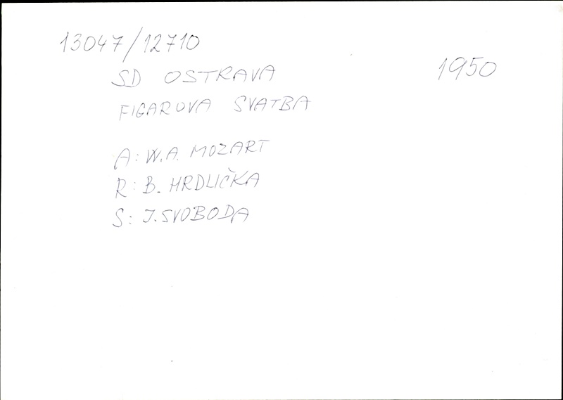 Almaviva:Jiří Wiedermann; Hraběnka:Ludmila Dvořáková; Zuzanka:Alice Spohrová (alternation); Miloslava Šeflová (alternation); Cherubín:Jiřina Ogounová (alternation); Zlatuše Skýpalová (alternation); Figaro:Jiří Herold (alternation); Rudolf Kasl (alternation); Marcelina:Helena Zemanová (alternation); Ludmila Komancová (alternation); Bartolo:Rudolf Juza (alternation); Jan Hadraba (alternation); Bazilio:Jaroslav Deršák; Antonio:Ladislav Havlík; Barbarina:Milada Šafránková; Curcio:Stanislav Talafa; První selské děvče:M. Menčíková; Druhé selské děvče:Olga Vojnarová