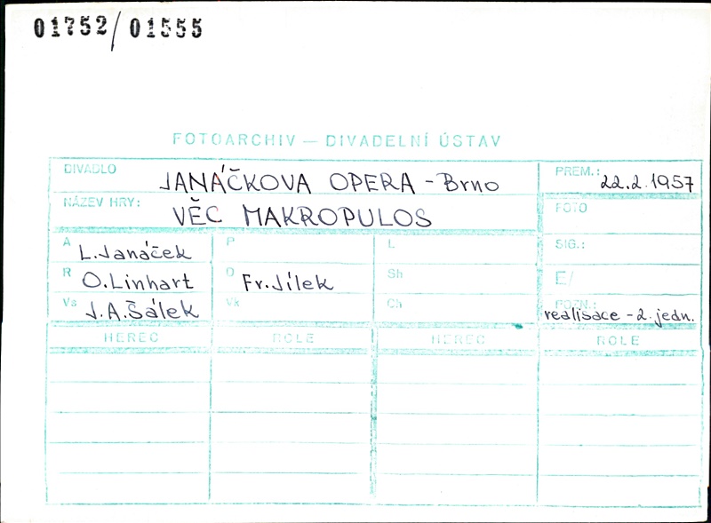 Conductor:František Jílek; Stage Director:Oskar Linhart; Set Designer:Josef Adolf Šálek; Chorus Master:Vilibald Rubínek