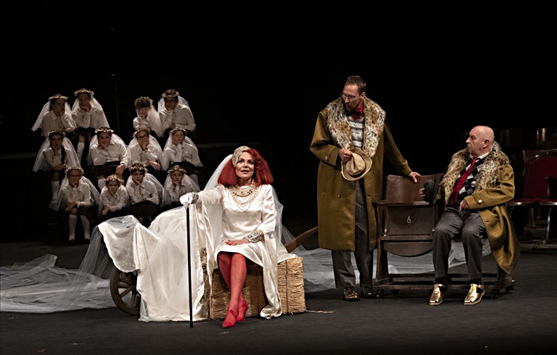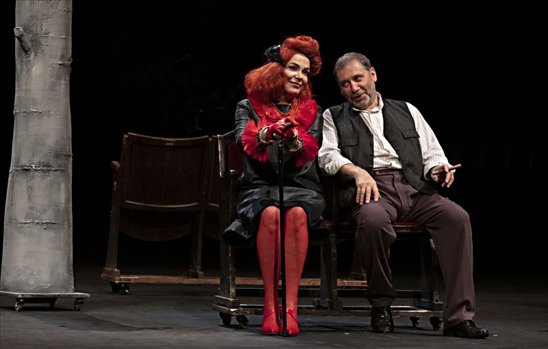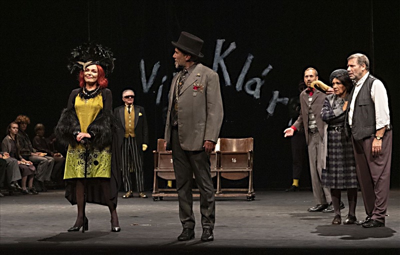 Claire Zachanassianová:Dagmar Havlová-Veškrnová; Její manželé VII - IX:Denny Ratajský; Její manželé VII - IX:Marek Holý; Butler:Petr Kostka; Koby:Václav Svoboda; Loby:Jiří Maryško; Toby, Roby: (externista); Ill:Tomáš Töpfer; Jeho žena:Eva Režnarová; Jeho dcera:Zuzana Vejvodová; Jeho syn:Marek Holý; Jeho syn:Kryštof Rímský; Farář:Jiří Šesták; Starosta:Aleš Procházka; Učitel:Tomáš Pavelka; Lékař:Oldřich Vlach; Lékař:Pavel Rímský; Policista:Tomáš Dastlík; Malíř:Jiří Plachý; Výpravčí:Viktor Javořík